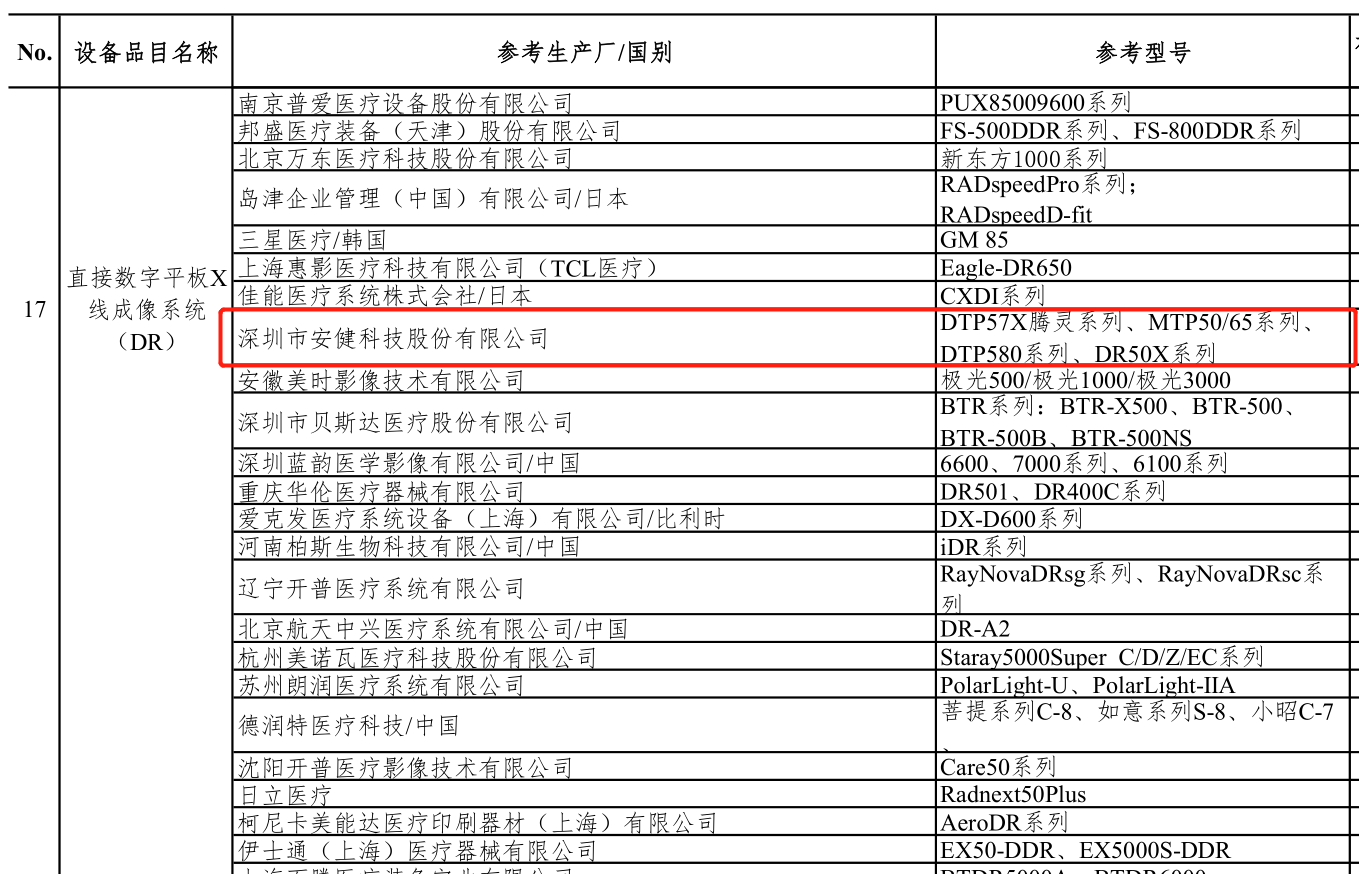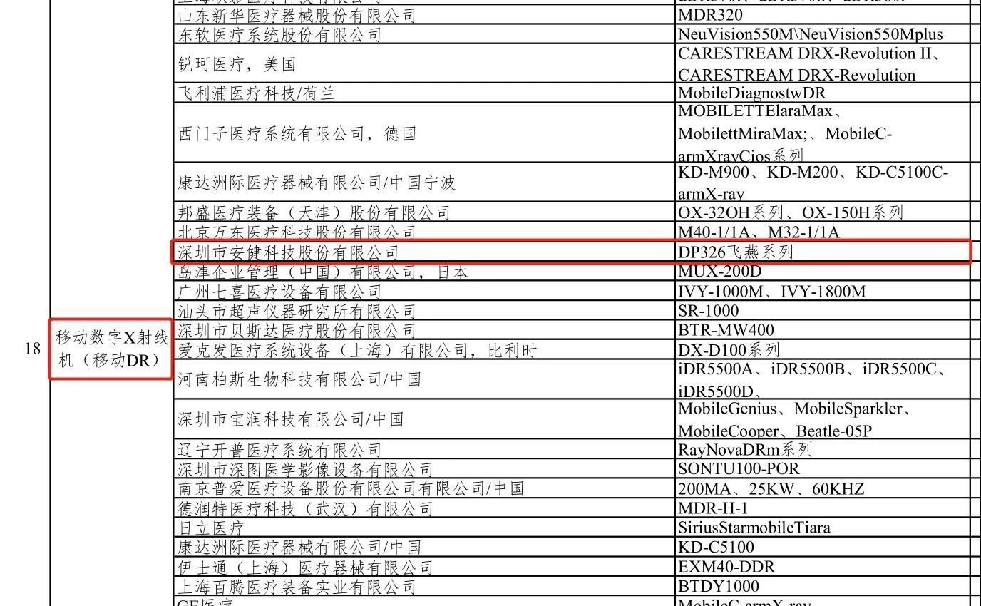 為全力配合國家衛(wèi)生健康委疫情防治工作需要,220日,中國醫(yī)學(xué)裝備協(xié)會發(fā)布《新冠肺炎疫情防治急需醫(yī)學(xué)裝備目錄(第一批,第二批)》。該目錄由行業(yè)專家共同研究擬定,供各地疫情防治有關(guān)單位決策參考,以有效支援一線醫(yī)務(wù)人員,全力抗擊新冠肺炎感染疫情。安健科技包括DTP57X騰靈動態(tài)平板DR系列、DTP580動態(tài)平板DR系列、DP326飛燕移動平板DR系列、MTP50/65系列、DR50X系列在內(nèi)的多款設(shè)備入選該目錄。