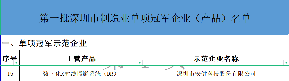 2023年1月6日,深圳市工業(yè)和信息化局公布《第一批深圳市制造業(yè)單項冠軍企業(yè)(產品)名單》,安健科技憑借在數字化X射線攝影系統(tǒng)(DR)領域的技術創(chuàng)新與領先的市場占有,獲評深圳市單項冠軍示范企業(yè)。