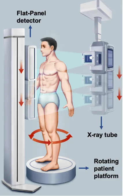 WR-3D立位錐束斷層容積成像系統(tǒng)采用Cone-Beam錐束成像技術(shù)。通過(guò)旋轉(zhuǎn)站臺(tái)帶動(dòng)患者低速旋轉(zhuǎn),從不同角度捕獲透視圖像并重建出患者掃描部位的三維容積圖像。錐束成像技術(shù)擁有更大的錐角及更大的Z軸覆蓋范圍,實(shí)現(xiàn)全脊柱區(qū)域完全覆蓋。