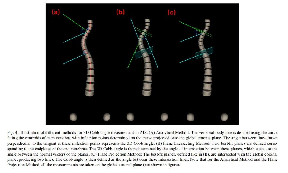 Analytical method(AM):椎體線(xiàn)被定義為最適合每個(gè)椎骨的質(zhì)心(幾何中心)的曲線(xiàn)。這些質(zhì)心投影到全局冠狀平面上(由連接股骨頭和Z軸的線(xiàn)定義)。WR-3D系統(tǒng)將自動(dòng)將曲線(xiàn)的拐點(diǎn)(凹度發(fā)生變化的地方)識(shí)別為測(cè)量點(diǎn),然后在這些拐點(diǎn)處垂直于切線(xiàn)繪制直線(xiàn),這些垂直線(xiàn)之間的角度為三維Cobb角(下圖a)。