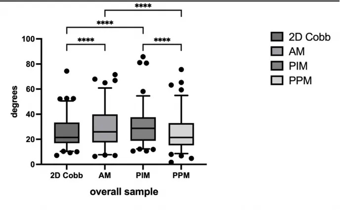 通過(guò)測(cè)量,三種三維測(cè)量方式都體現(xiàn)出了不同的脊柱彎曲評(píng)估值,這些差異可能會(huì)對(duì)臨床實(shí)踐產(chǎn)生重大影響。AM法和PIM法體現(xiàn)了更大的Cobb角數(shù)值,有助于更早或更積極的干預(yù)AIS;PPM法和二維Cobb角測(cè)量值無(wú)明顯的統(tǒng)計(jì)學(xué)差異,更適用于AIS的常規(guī)監(jiān)測(cè)。因此,在臨床應(yīng)用中應(yīng)仔細(xì)考慮每種模式的成像特征、具體的臨床場(chǎng)景以及對(duì)患者管理的潛在影響。