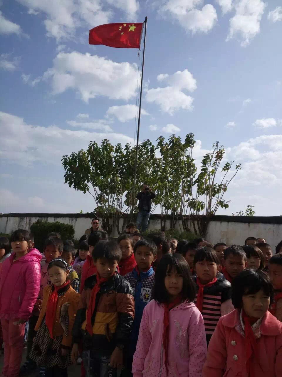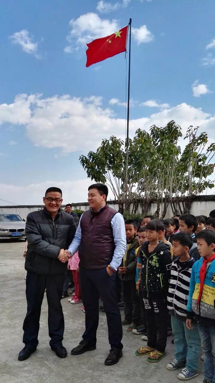 (藍(lán)天白云下,云南辦銷售總監(jiān)王總與校長(zhǎng)、孩子們?cè)谝黄?/span>)