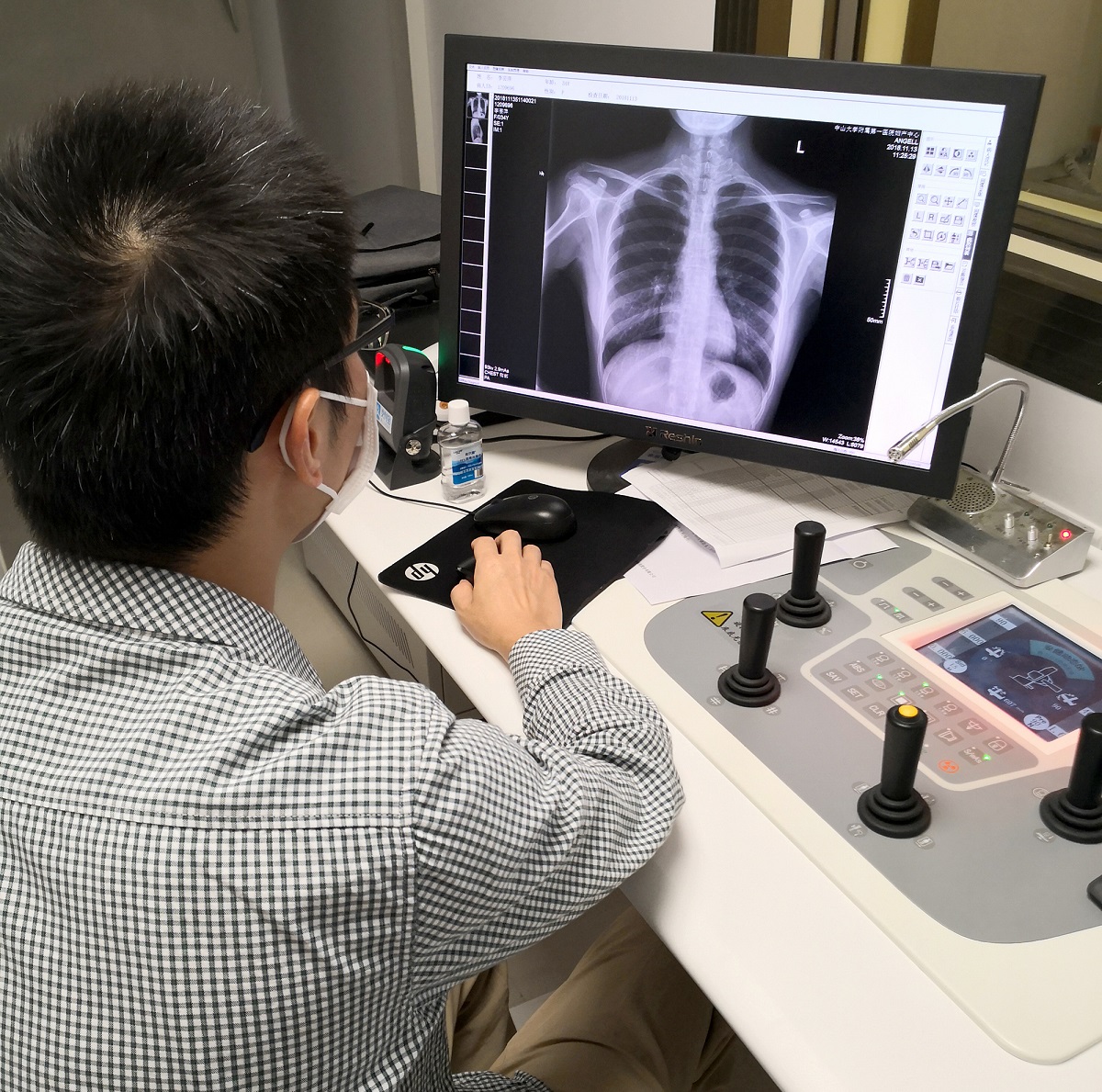 中山大學(xué)附屬第一醫(yī)院(簡稱中山一院)醫(yī)學(xué)影像科DR操作室內(nèi),放射技師清晰的擺位提示音,透過語音通話系統(tǒng)準(zhǔn)確傳導(dǎo)到患者。伴隨著放射技師輕輕按下曝光手閘,DR設(shè)備呼出一聲清脆的“滴”音,3秒后,一張清晰的X光胸片躍然于屏幕上。